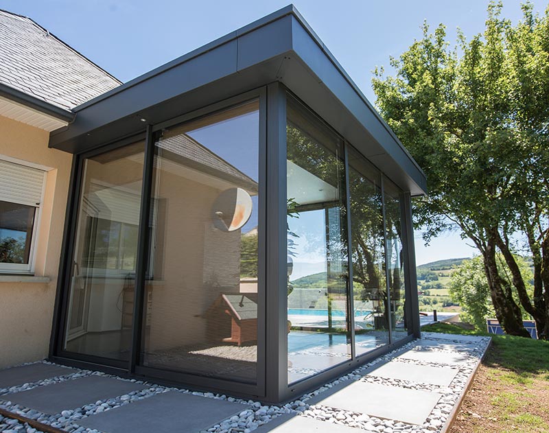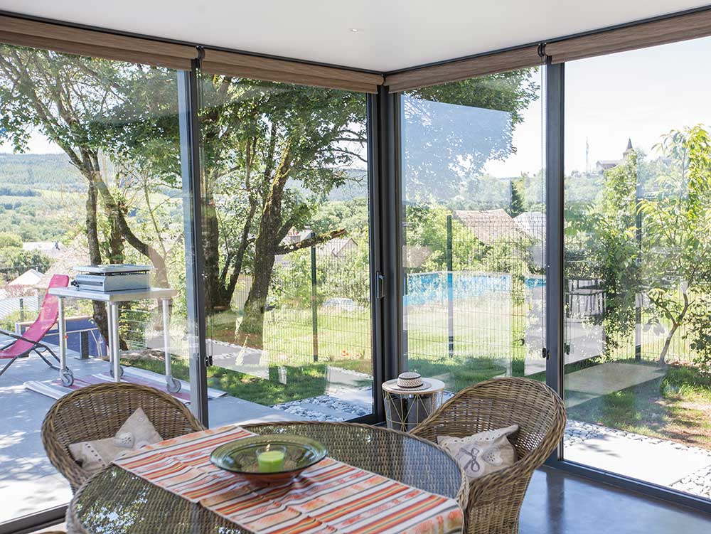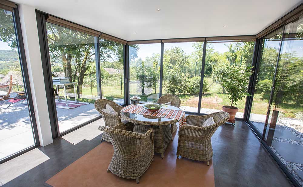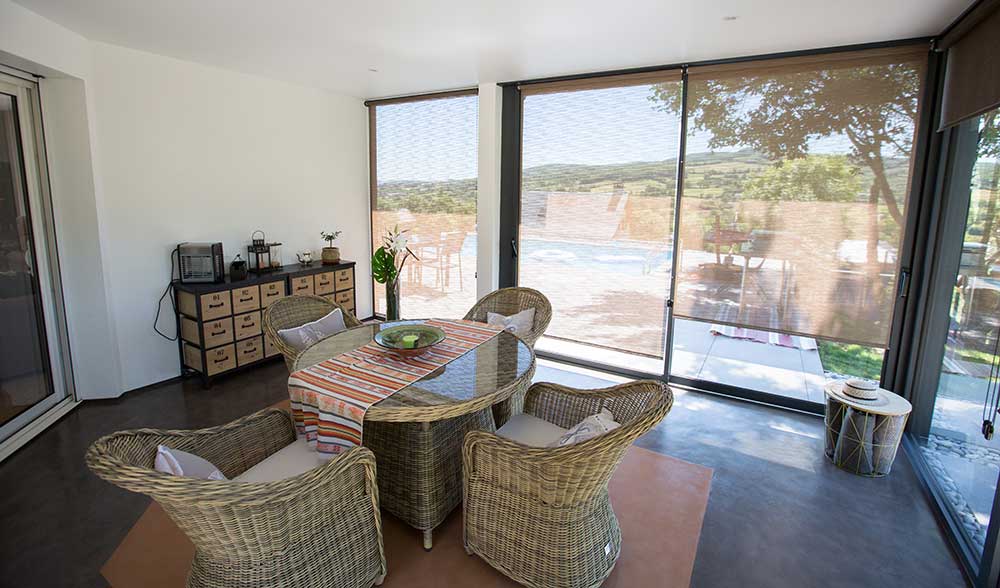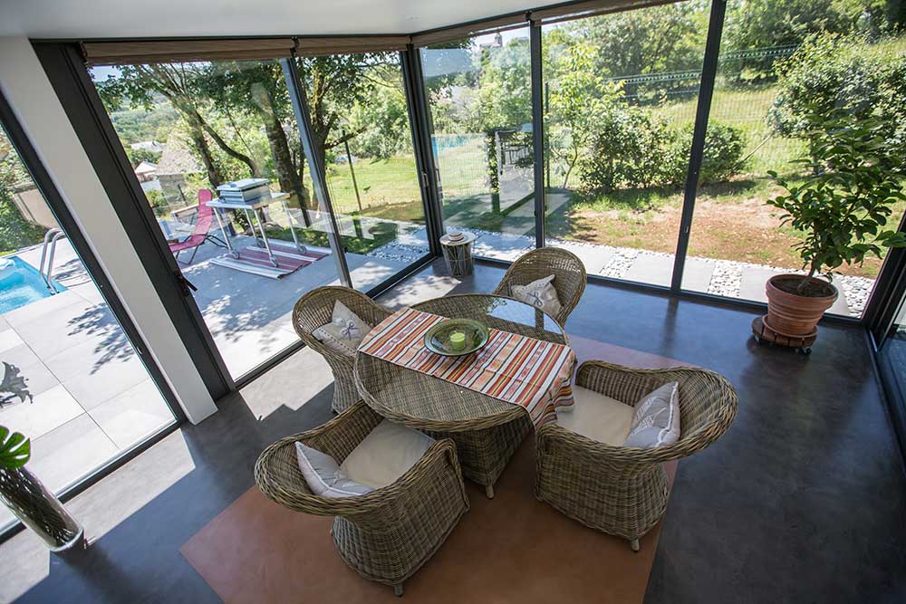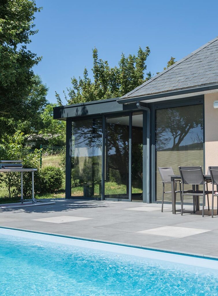 Pièce de liaison entre la maison, la terrasse extérieure et la piscine.