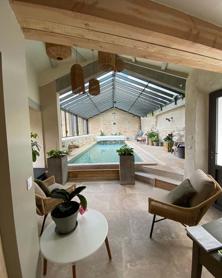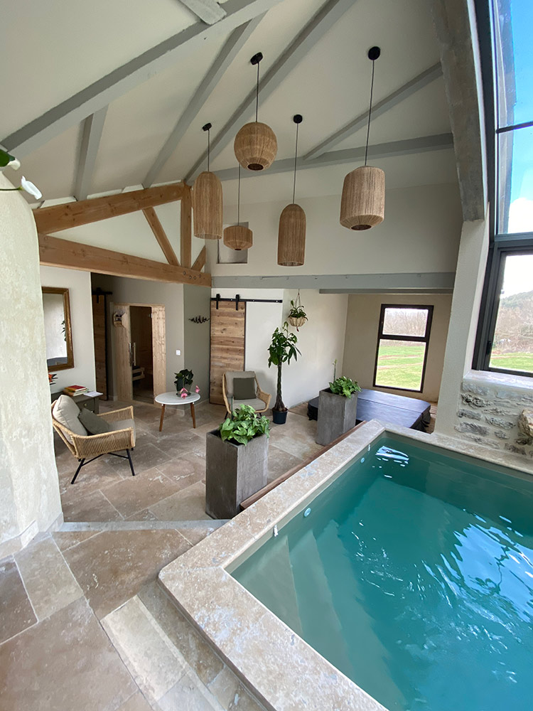 Créer une liaison entre deux bâtiments et couvrir la piscine pour un gîte, afin que les hôtes puissent privatiser l’espace détente comprenant une piscine chauffée, un spa et un sauna.
